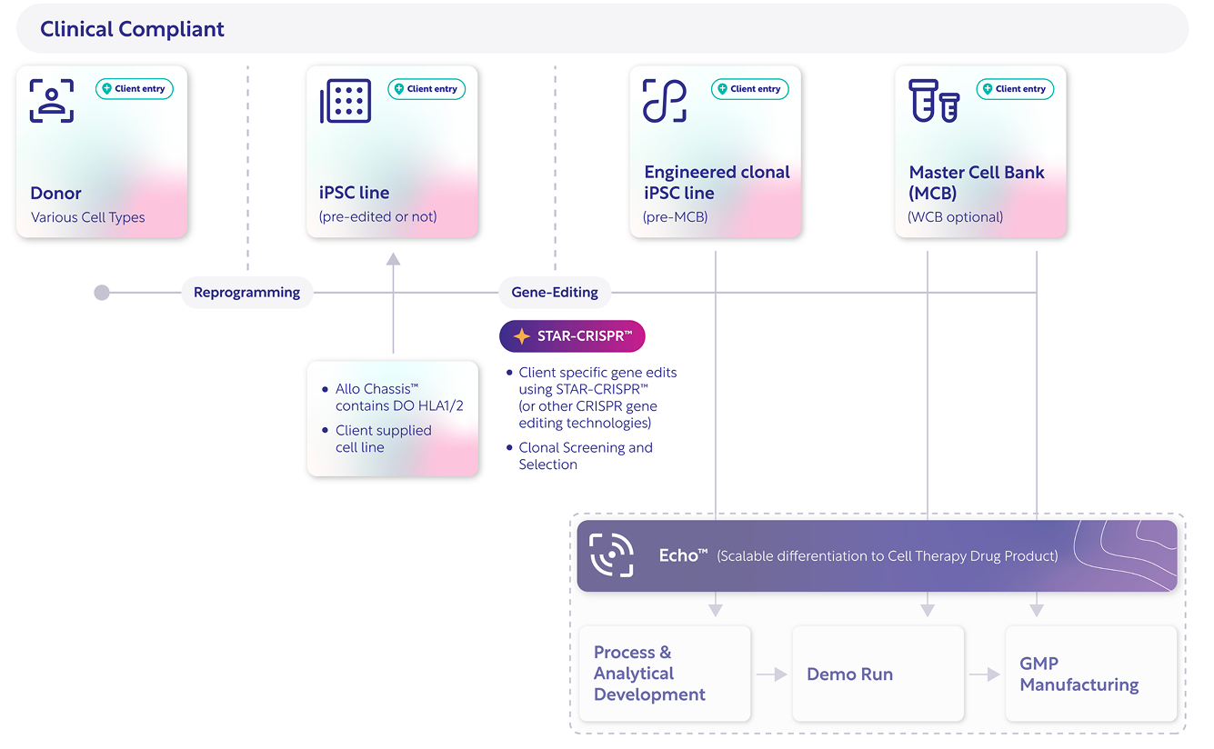 Proprietary platforms — Pulse™ and Echo™, technologies STAR-CRISPR™ and Allo Chassis™ — combined with end-to-end CDMO services to accelerate allogeneic iPSC-derived therapy development.